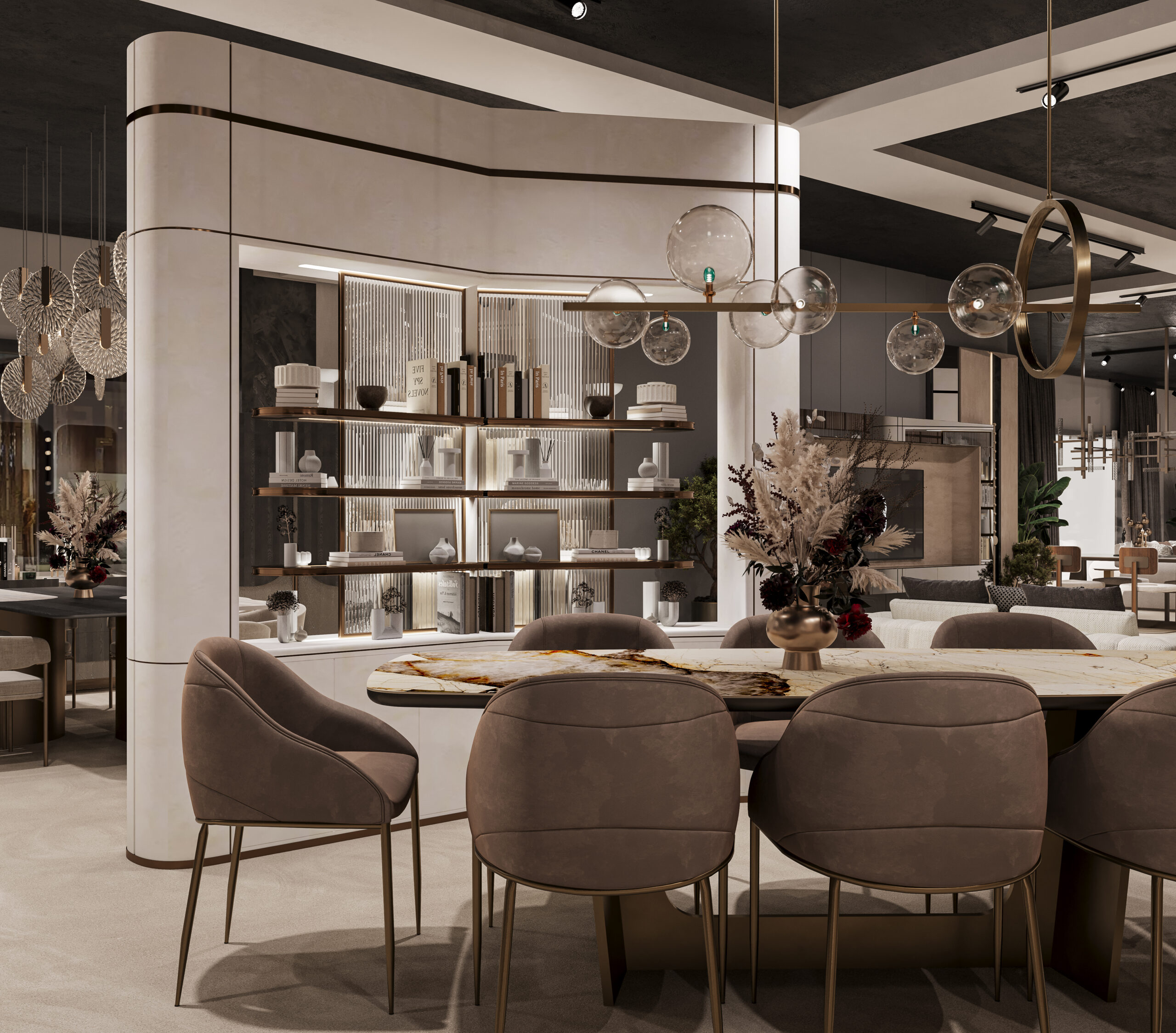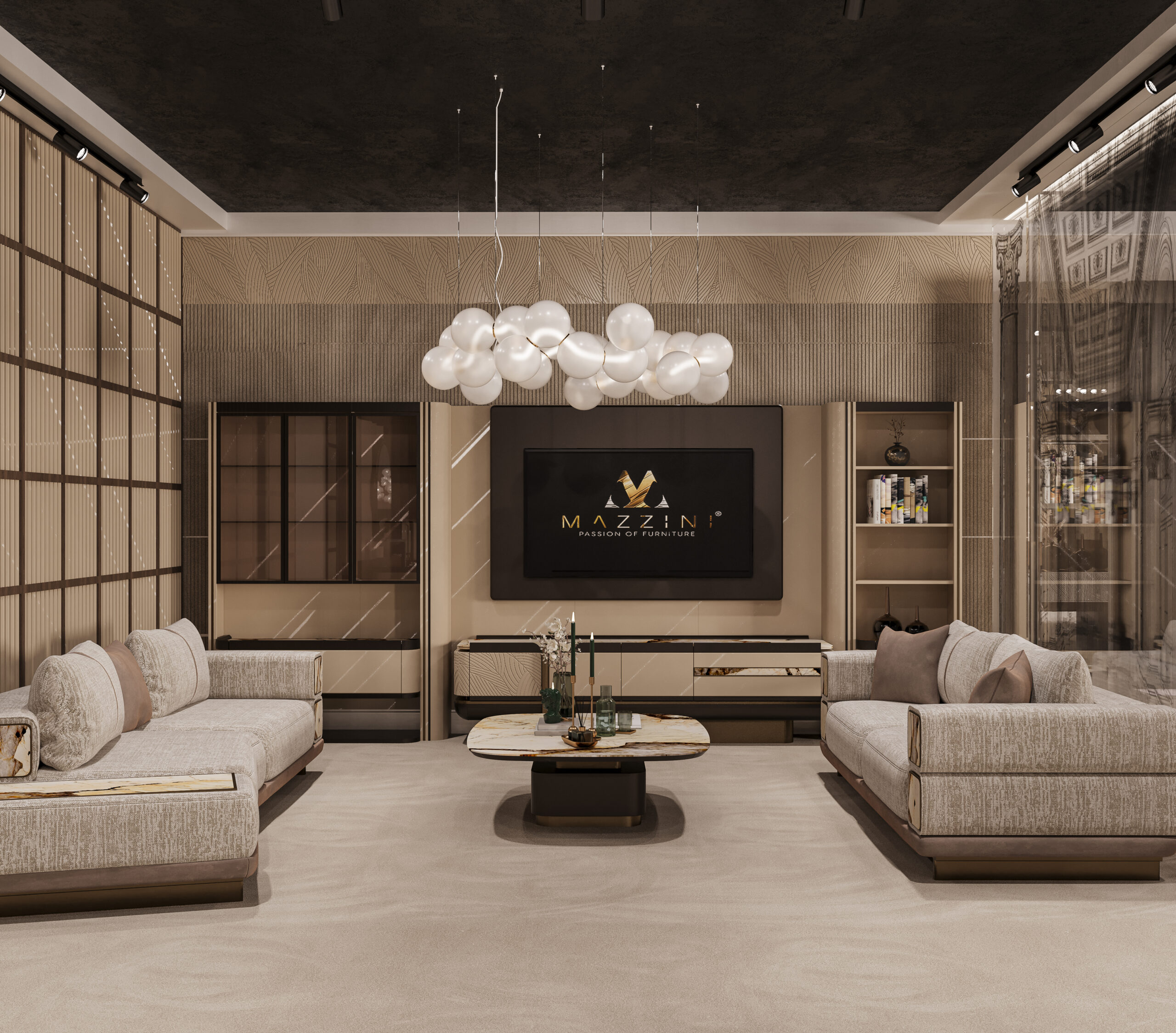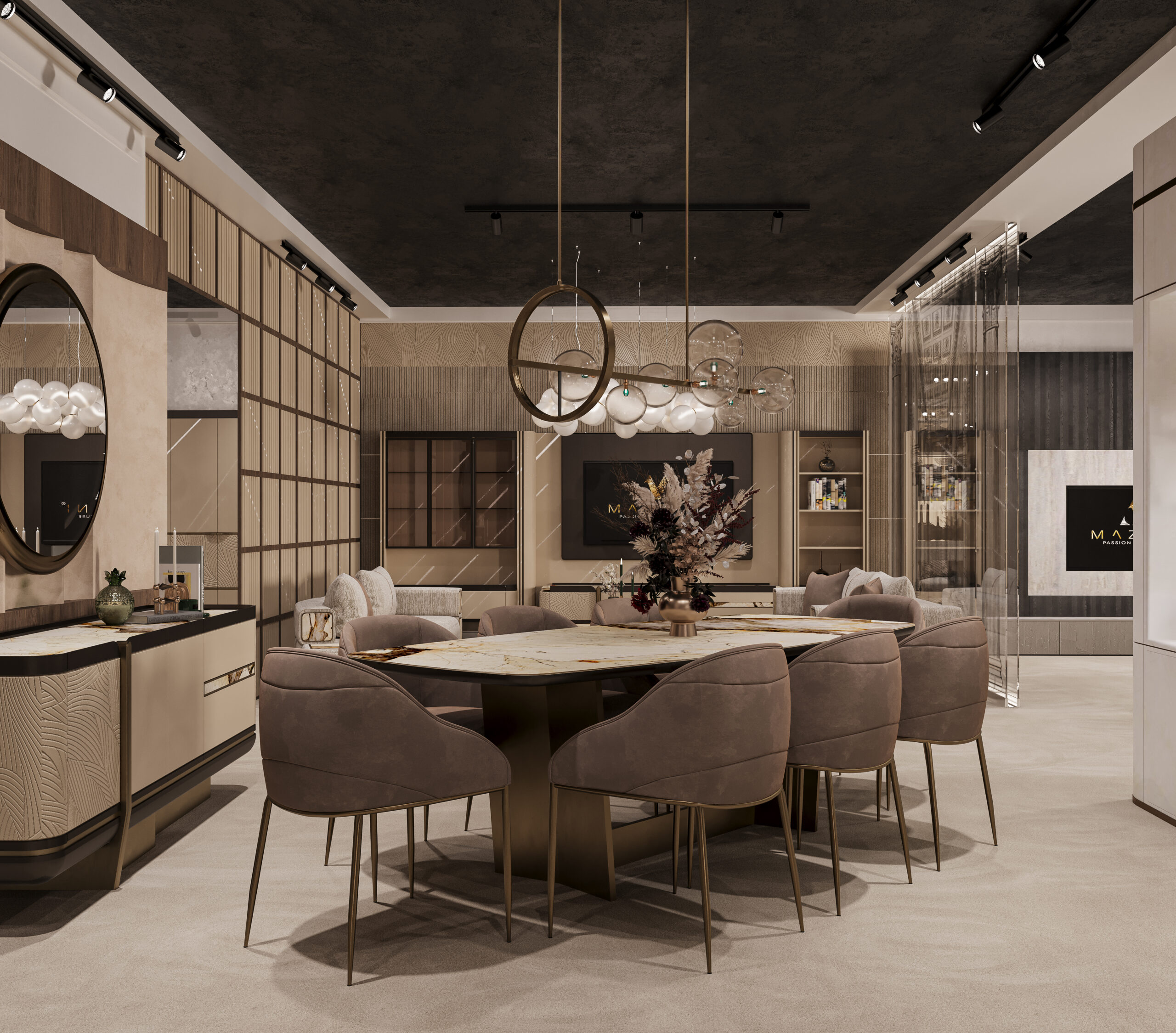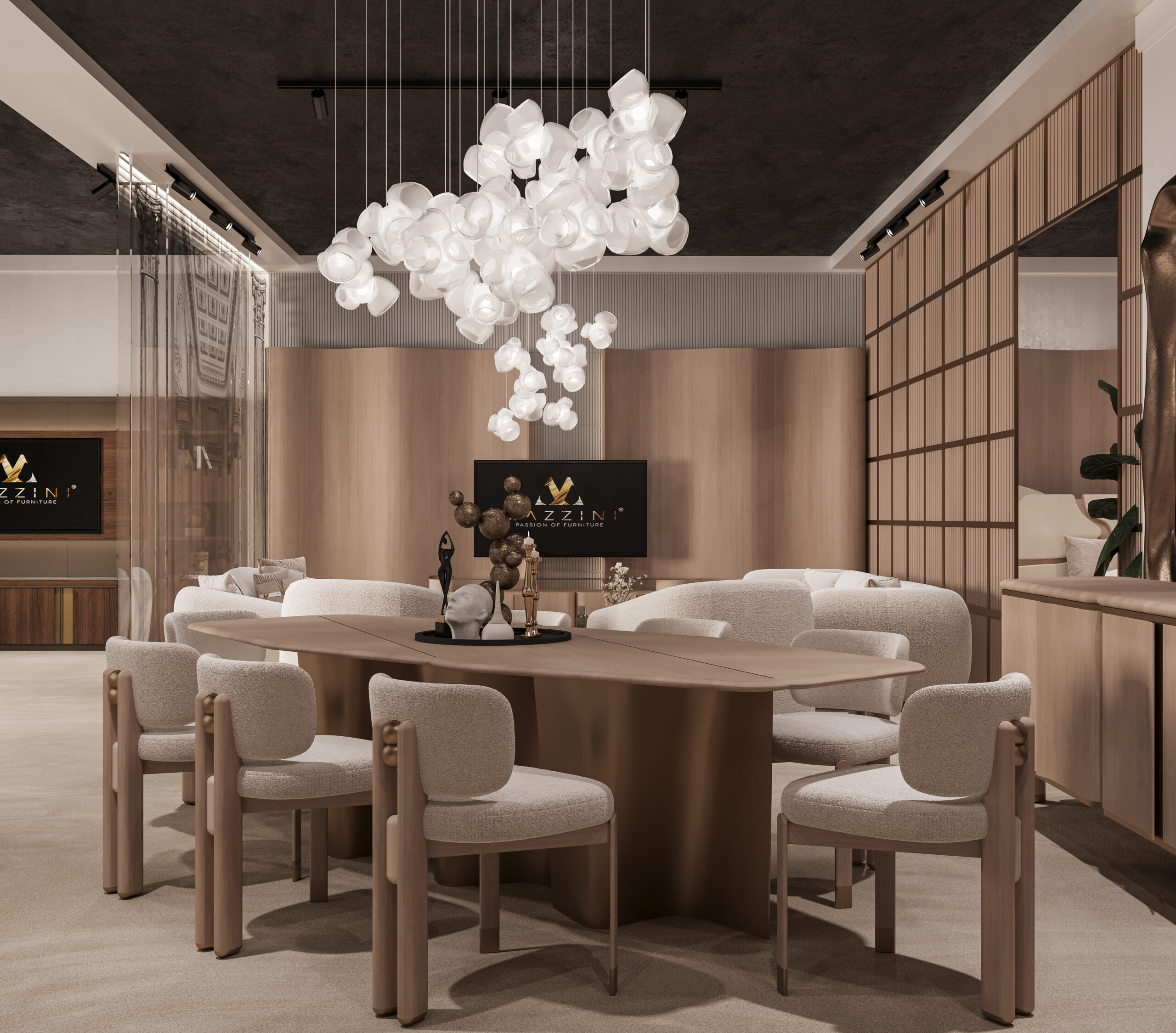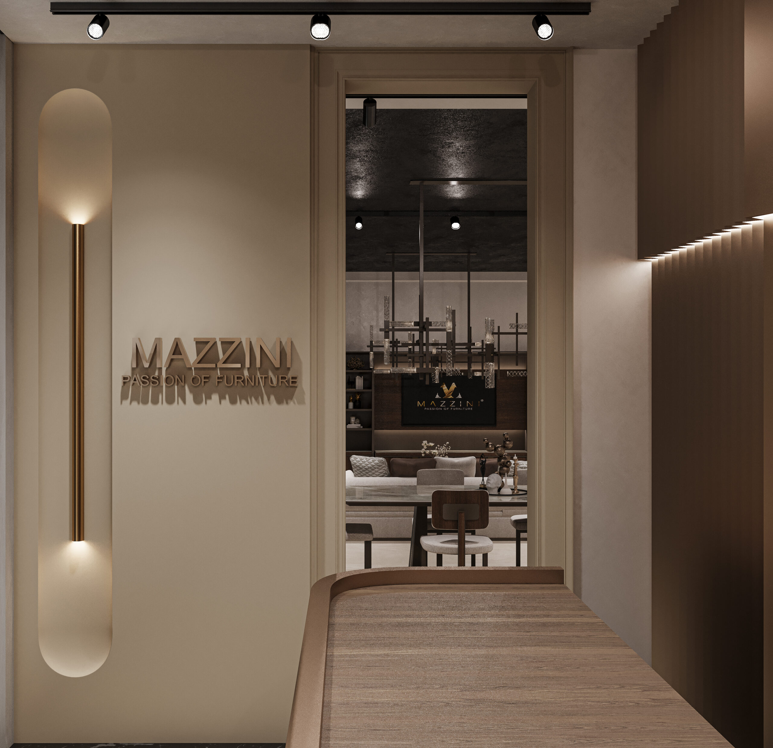 The Mazzini Furniture Fair Space captures the brand’s refined identity through architectural precision and gallery-like curation. A monumental reception desk and logo backdrop set the tone, enhanced by warm bronze tones and tailored lighting. Curved panels, sculptural shelving, and staged furniture collections elevate the space into an immersive design showcase. Distinct zones for dining, lounging, and relaxation reflect real-life settings with elevated comfort and style. Rich textures, velvet finishes, and custom luminaires transform the booth into a statement of lifestyle and design philosophy.