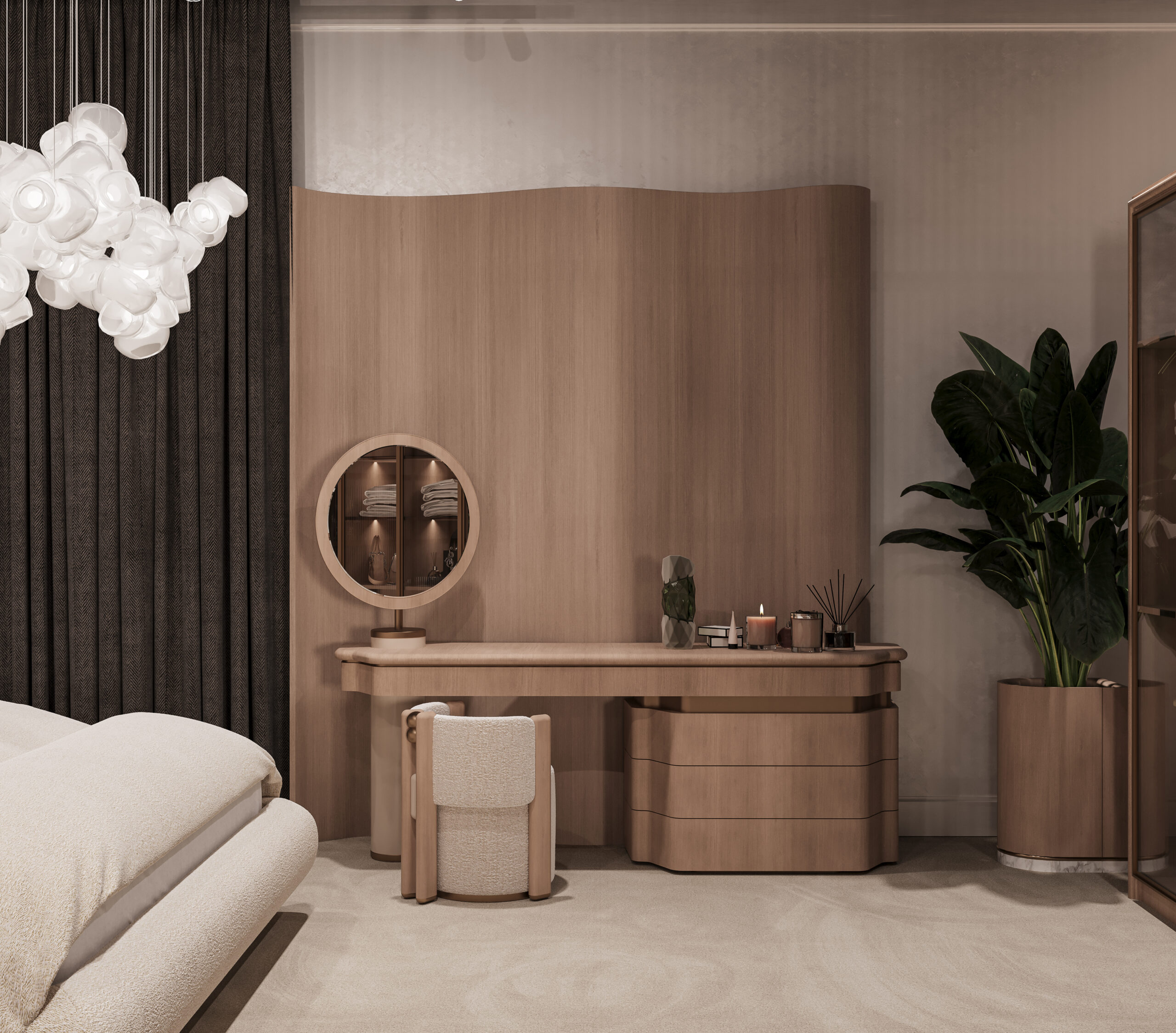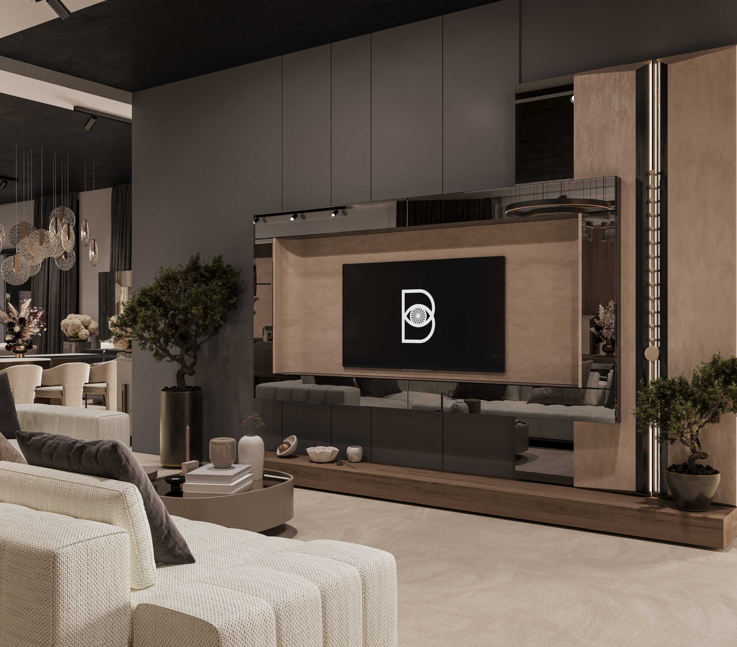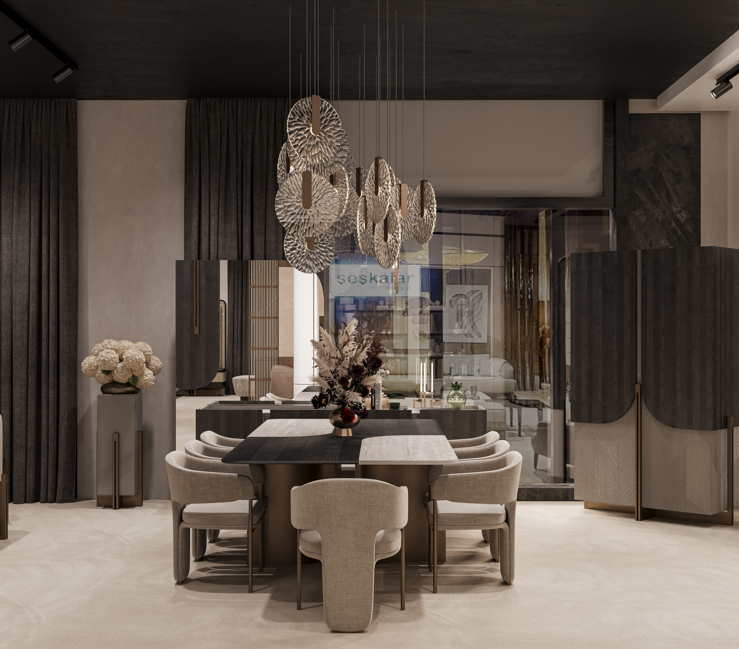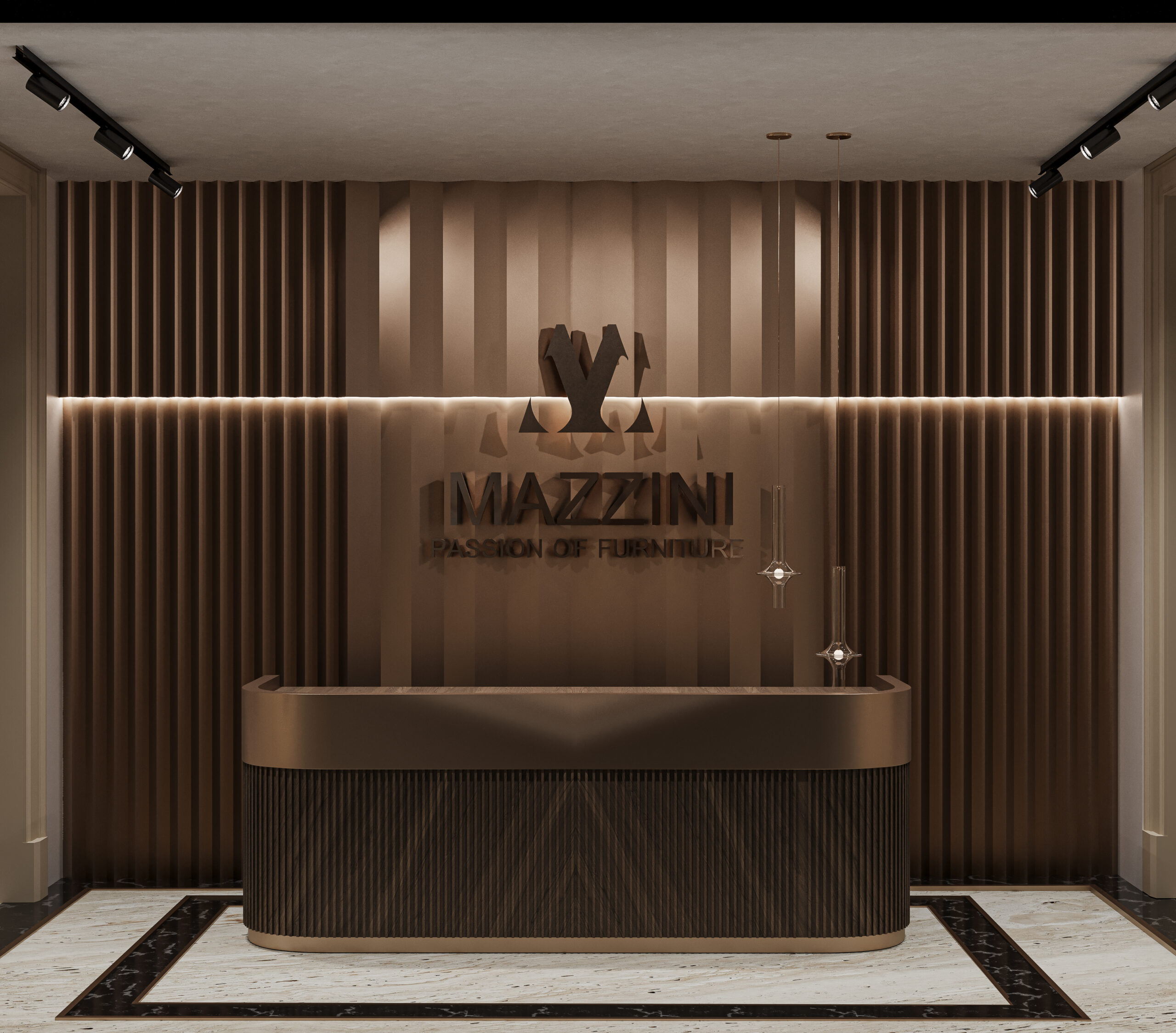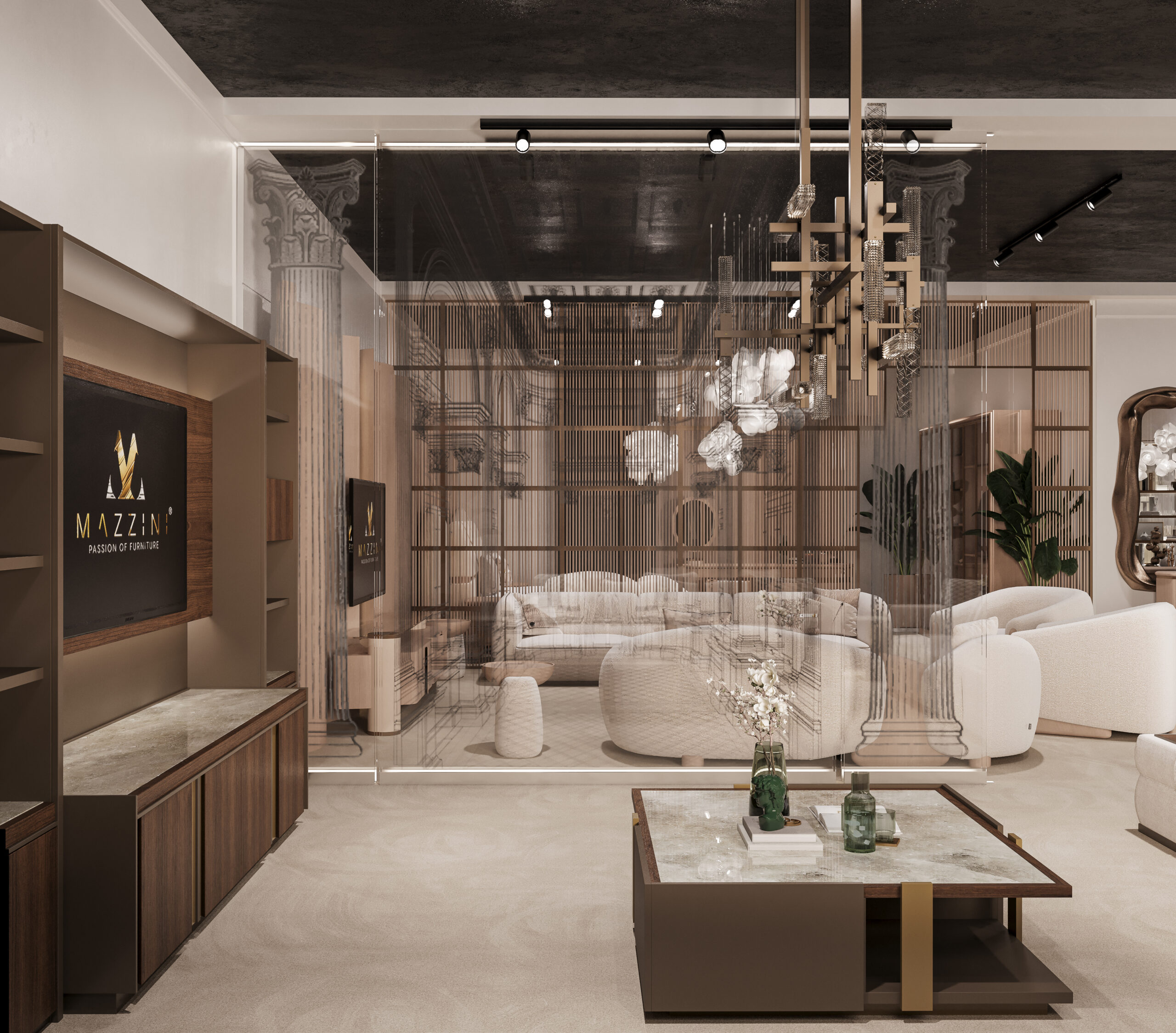 The Mazzini Furniture Fair Space captures the brand’s refined identity through architectural precision and gallery-like curation. A monumental reception desk and logo backdrop set the tone, enhanced by warm bronze tones and tailored lighting. Curved panels, sculptural shelving, and staged furniture collections elevate the space into an immersive design showcase. Distinct zones for dining, lounging, and relaxation reflect real-life settings with elevated comfort and style. Rich textures, velvet finishes, and custom luminaires transform the booth into a statement of lifestyle and design philosophy.